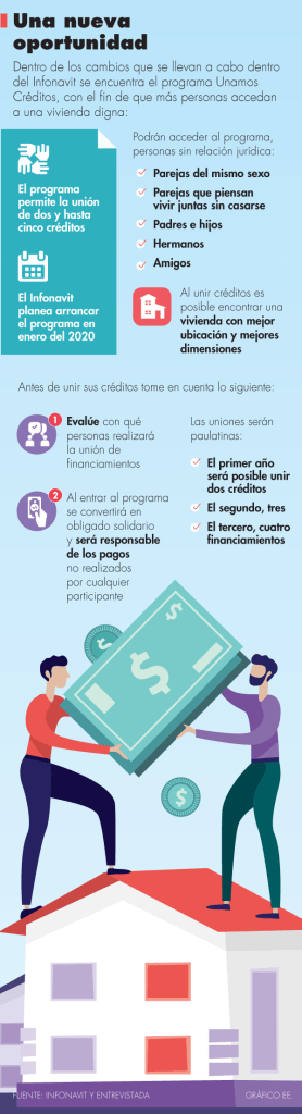 De acuerdo con Carlos Martínez, director general del Infonavit, en enero del 2020 existirán nuevas modalidades para que aquellas personas que deseen unir sus créditos hipotecarios, fuera de la opción tradicional, es decir, ahora parejas del mismo sexo, hermanos, padres e hijos podrán llevar a cabo la unión de sus créditos para acceder a una vivienda, ello a través del programa Unamos Créditos.