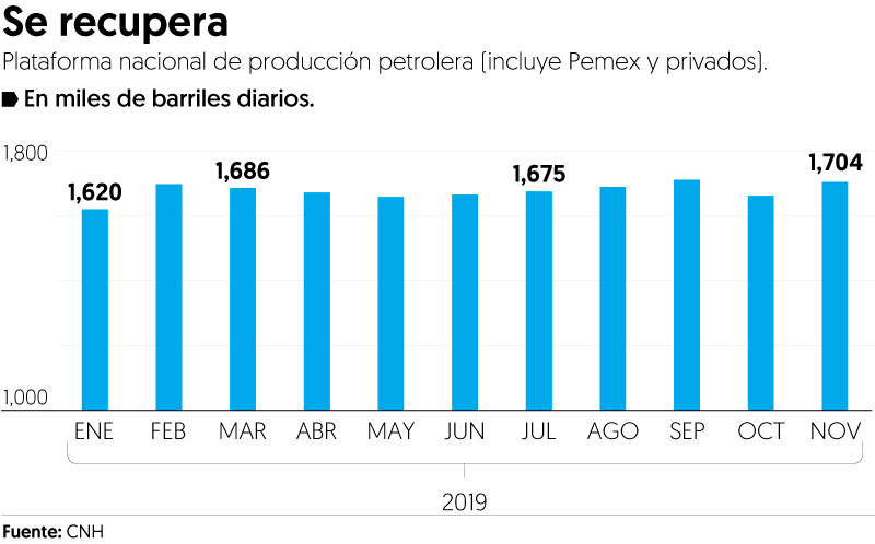 En la comparación anual, la producción de noviembre de 2019 es solo 6 mil barriles menor a la del mismo mes del año pasado.