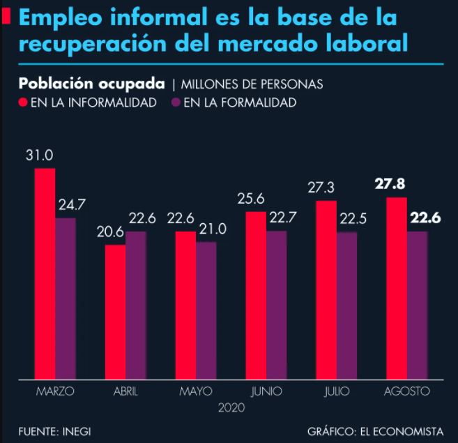 El ritmo de recuperación del empleo tras los meses más difíciles para el mercado laboral por el efecto del Covid-19 ha sido más rápido en el sector informal. De mayo a agosto se recuperó 70% el empleo informal y 43% el empleo formal perdido durante la cuarentena. De 12.5 millones de personas que perdieron su empleo entre marzo y abril de 2020, han regresado a sus puestos más de 7 millones, según cifras del Inegi.