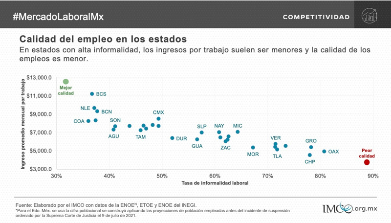 De acuerdo con un análisis del IMCO, con cifras del Inegi, existe una disparidad en la competitividad y la calidad del empleo en hombres y mujeres. Mientras que, en el 3T21 las mujeres que percibieron un ingreso por su trabajo tuvieron ingresos laborales promedio de 5,980 pesos al mes, los hombres recibieron 7,588.