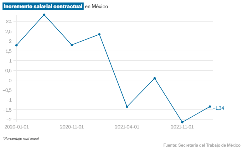 No hay medida que pueda con el imparable aumento de precios en México. Mientras que a inicios de año los salarios contractuales -que conforman alrededor del 60% del ingreso de los trabajadores formales- tuvieron incremento nominal de 6,7% en febrero (el mayor en lo que va de esta administración), de acuerdo con datos de la Secretaría del Trabajo y Previsión Social, que tras el efecto de la inflación, se traduce en una pérdida en el poder adquisitivo de -1,34%.