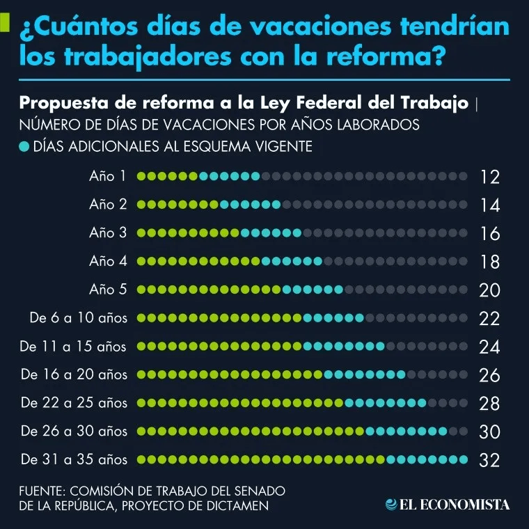 El primer paso en el Senado mexicano se dio con una votación unánime en la Comisión de Trabajo. Falta que pase al Pleno y luego a la Cámara de Diputados. También queda pendiente que se defina con claridad el transitorio: ¿cuánto tiempo se tardará en ser una realidad y cómo se dará este aterrizaje? De manera extraoficial, las organizaciones empresariales han expresado su conformidad con el objetivo de duplicar el número de días de vacaciones garantizados, pero prefieren que el incremento sea gradual y se complete por ejemplo en un periodo de tres a cinco años, no todo en un solo golpe.