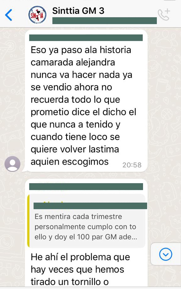 Hasta nuestra redacción, de manera anónima nos hicieron llegar unas capturas de pantalla de grupos de WhatsApp que tiene SINTTIA con los trabajadores, en donde se nota claramente la molestia de los trabajadores, además ahí mismos delegados del propio SINTTIA aceptan que el CILAS tiene injerencia en este sindicato supuestamente independiente.