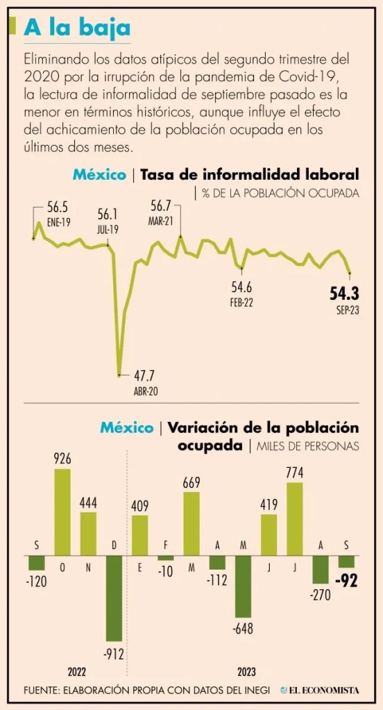 La tasa de informalidad se ubicó en 54.3% en septiembre, el nivel más bajo desde junio de 2020, esto sin contar los meses con mayor afectación del mercado laboral por la pandemia, de acuerdo con la Encuesta Nacional de Ocupación y Empleo (ENOE).