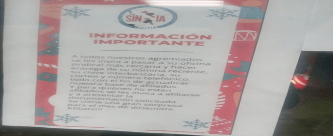 El SINTTIA sigue haciendo de las suyas en GM Silao, pues recientemente solicitó por medio de un documento pegado en sus oficinas sindicales que se encuentran dentro de la planta, que los afiliados al sindicato pasarán a entregar una nómina reciente, acompañada de su clabe interbancaria con la finalidad de actualizar su bate de datos.