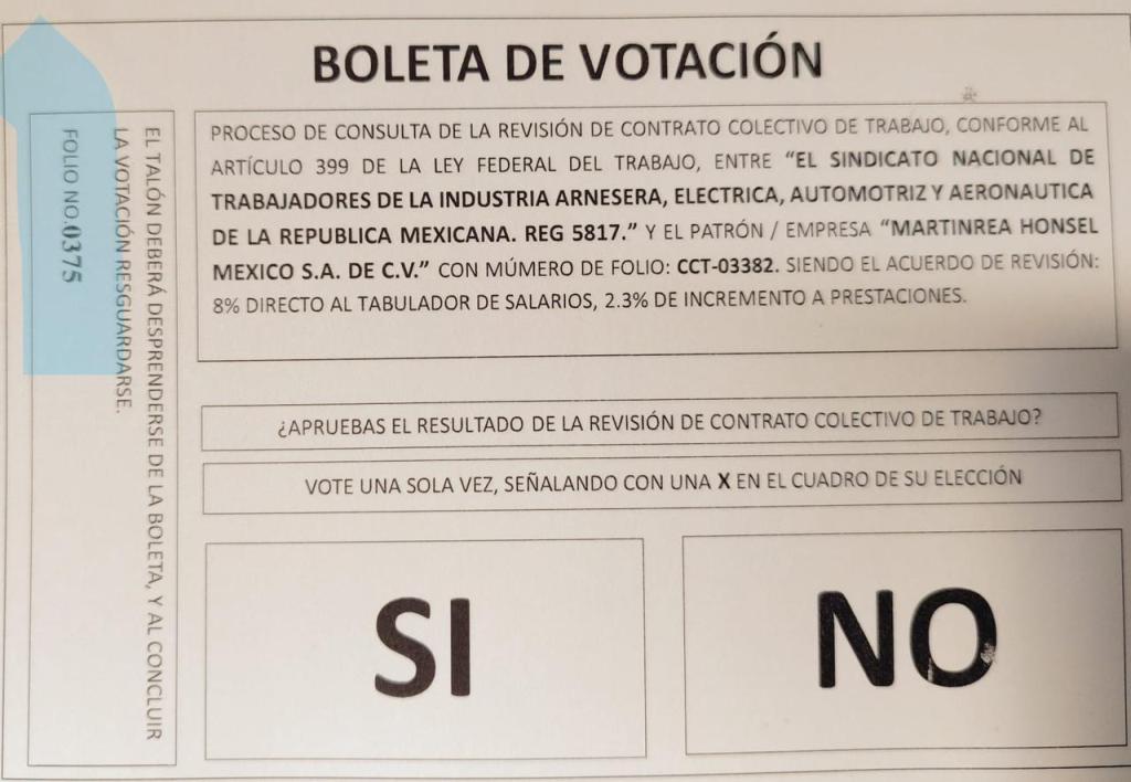 El sindicato de Martinrea ha asegurado que el proceso de votación para la consulta por Revisión de Contrato Colectivo de Trabajo (CCT) se llevará a cabo con total legalidad y transparencia. En un esfuerzo por garantizar la integridad del proceso, han implementado medidas rigurosas, como el uso de boletas rotuladas y foliadas, lo que impide la intervención de boletas falsas o adicionales. Este formato de boletas garantiza que cada voto sea exacto y refleje fielmente la voluntad de los trabajadores. Mismas que son subidas a la plataforma y validadas por la autoridad en tiempo y forma.